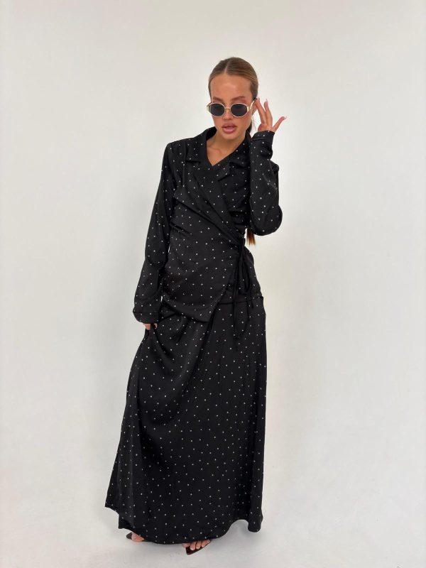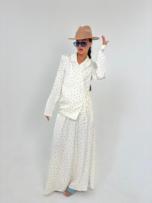 חליפת חצאית מבד סאטן, ג'קט דאבל אובר סייז עם ביטנה מלאה, שרוולים ארוכים, כריות בכתפיים, חצאית בגיזרה ישרה עם גומי במותן, ביטנה מלאה. החליפה מגיעה במידה אחת ONE SIZE ומתאימה עד למידה 42-44/46.
